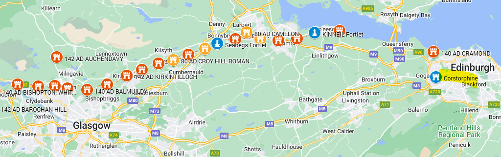 The Antonine Wall was built in 142 AD and ran from Glasgow to Bo’Nes near Edinburgh creating a barrier between the Highlands and central Scotland. There was a fort every few miles.