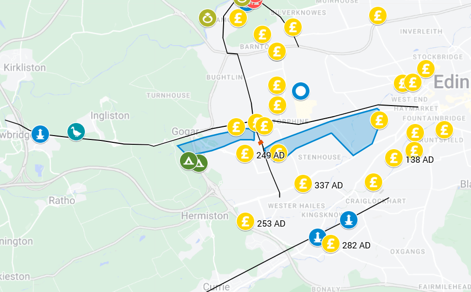 Along St Johns Road two coins of the same period were found, one in front of St Thomas’s church and the other at the Drumbrae roundabout.